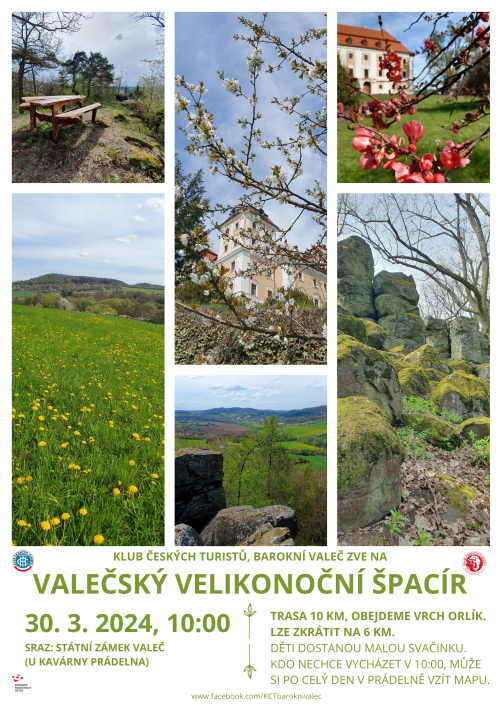 KČT, Barokní Valeč Vás zve na VALEČSKÝ VELIKONOČNÍ ŠPACÍR. Sobota 30.03.2024 v 10:00 hod. - sraz Státní zámek Valeč (Prádelna) Trasa 10 km (lze zkrátit na 6 km) obchází vrch Orlík.