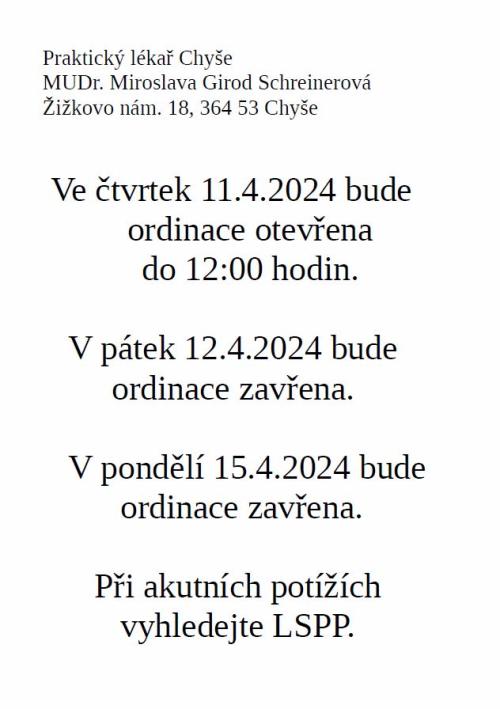 Ordinace praktické lékařky MUDr. Schreinerové oznamuje, že 11.4.2024 bude ordinace otevřena do 12:00 hodin, 12.4.- 15.4.2024 neordinuje. Při akutních potížích vyhledejte LSPP.