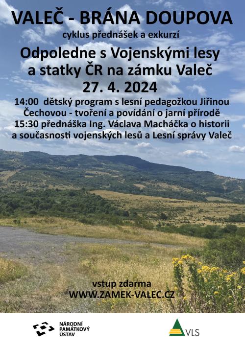 Státní zámek Valeč, sál ve správní budově u zámku Od 14:00 hodin proběhne pod vedením lesní pedagožky Jiřiny Čechové program pro děti Od 15:30 hodin bude přednáška o historii a současnosti vojenských lesů