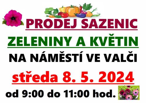 Ve středu 8. 5. 2024 proběhne od 09:00 do 11:00 hod. na náměstí ve Valči prodej sazenic zeleniny a květin.