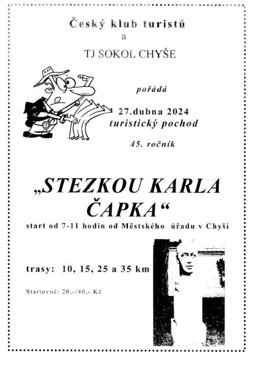 Pochod se koná v sobotu 27.04.2024, start je od 7:00-11:00 hodin od MÚ v Chyši.