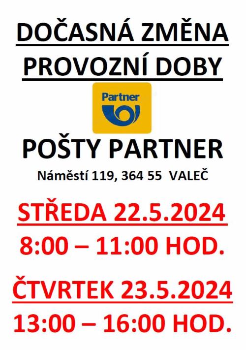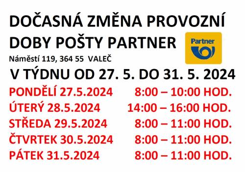 Dočasná změna provozní doby pošty Partner ve Valči od 27.05.2024 do 31.05.2024