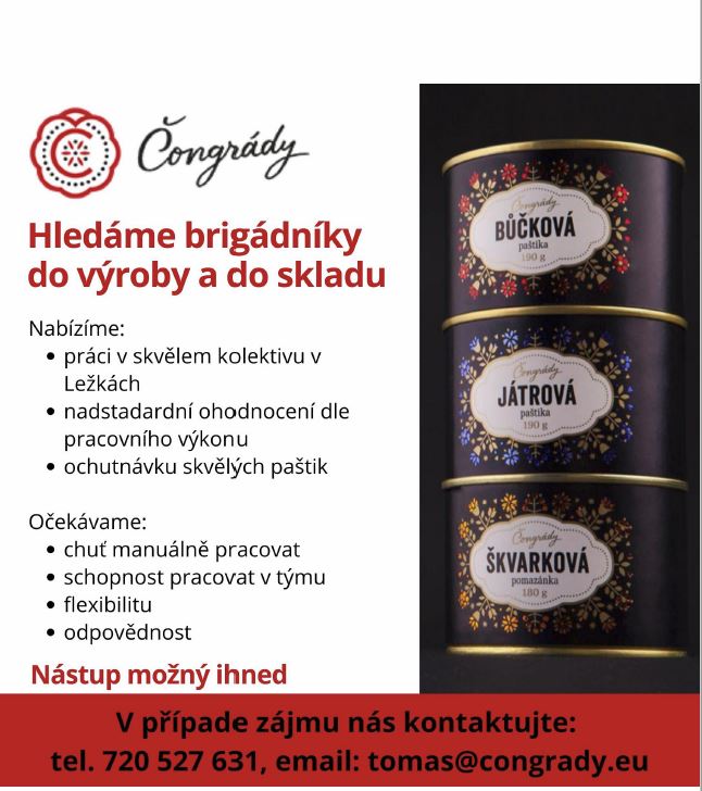 Společnost Delius s.r.o., výrobce paštik a konzervovaných výrobků Čongrády, která má výrobnu v Ležkách u Lubence hledá brigádníky.