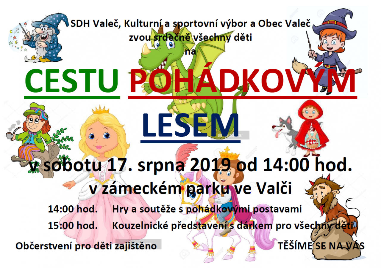 SDH Valeč, Kulturní a sportovní výbor a Obec Valeč vás zvou na Cestu pohádkovým lesem, která se koná v sobotu 17. srpna 2019 od 14:00 hodin v zámeckém parku ve Valči.