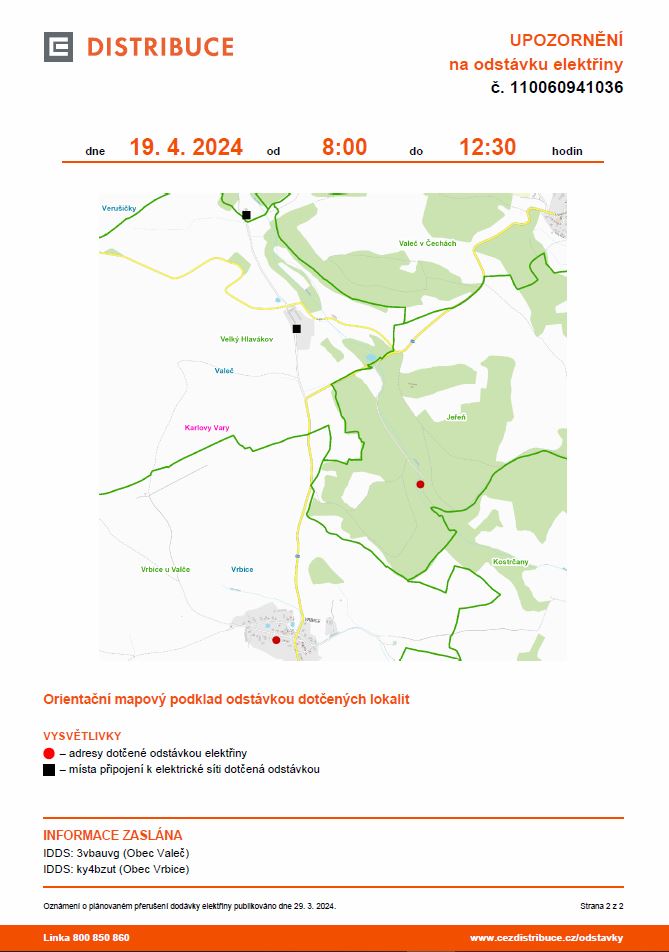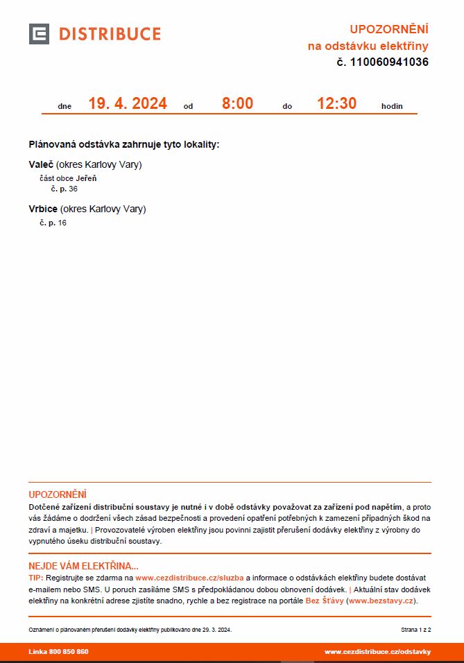 Plánovaná odstávka elektřiny dne 19.04.2024 od 8:00 - 12:30 hodin v lokalitě Jeřeň č.p. 36 a lokalitě Vrbice č.p. 16.