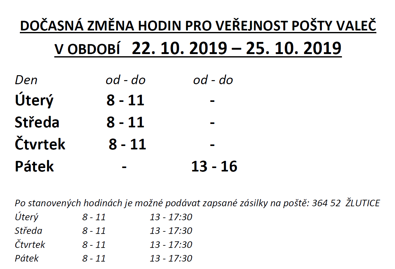 Dočasná změna hodin pro veřejnost pošty Valeč v období 22.10.2019 - 25.10.2019