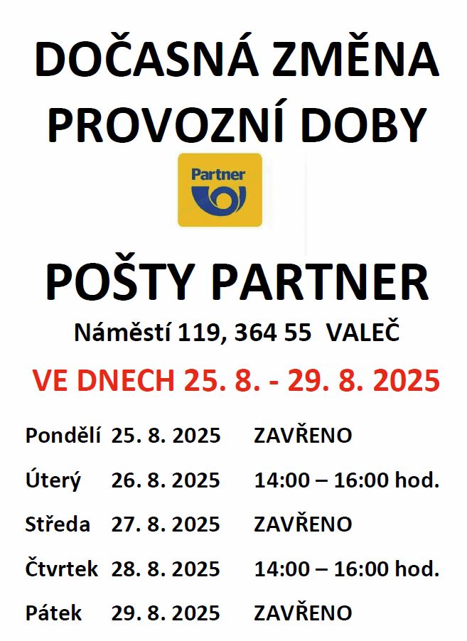 Dočasná změna provozní doby pošta Partner Valeč