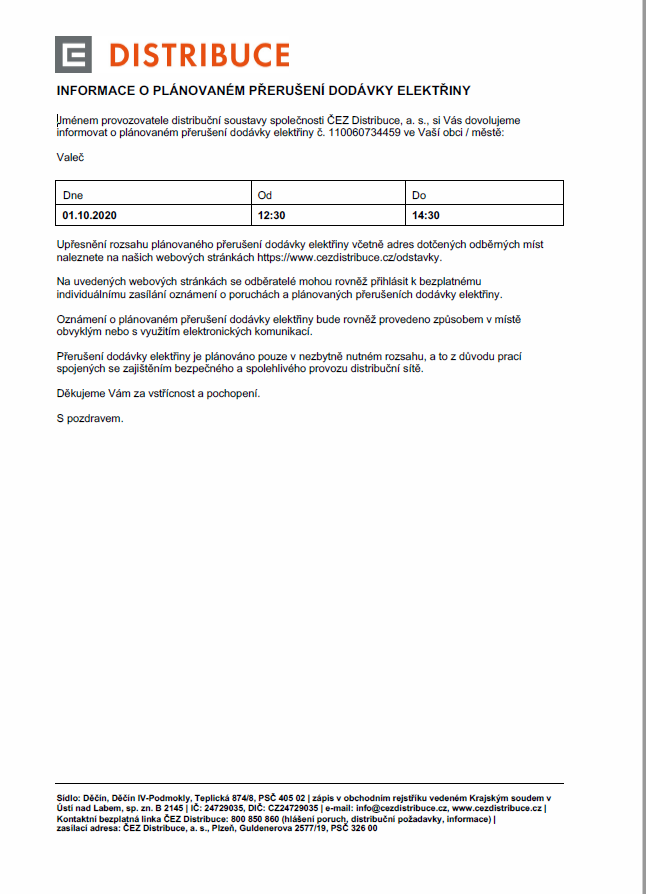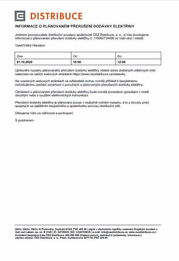 Informace o plánovaném přerušení dodávky elektřiny - Velký Hlavákov, Valeč