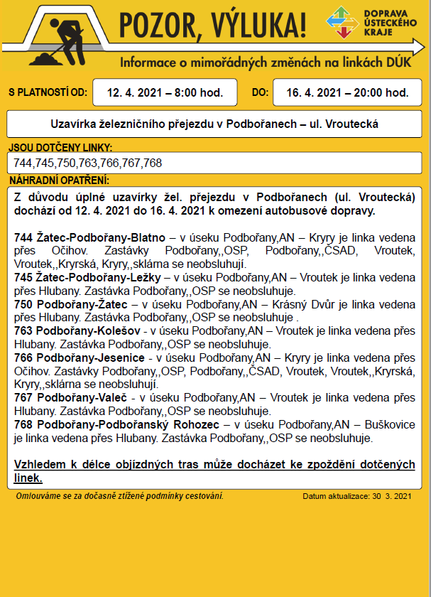 Informace o výluce autobusové dopravy z důvodu uzavírky žel. přejezdu v ul. Vroutecká v Podbořanech 12. 4. – 16. 4. 2021.