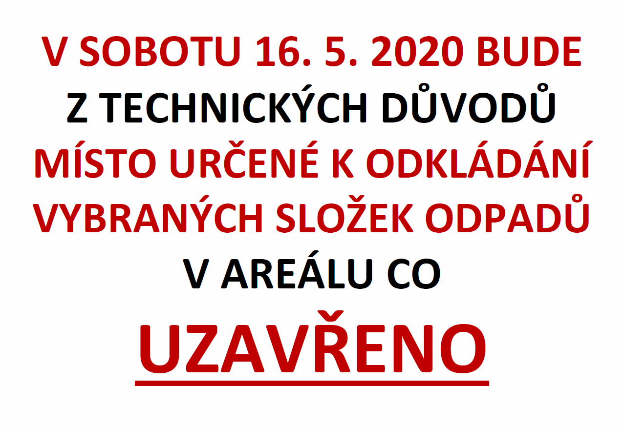 V SOBOTU 16. 5. 2020 BUDE Z TECHNICKÝCH DŮVODŮ MÍSTO URČENÉ K ODKLÁDÁNÍ VYBRANÝCH SLOŽEK ODPADŮ V AREÁLU CO UZAVŘENO