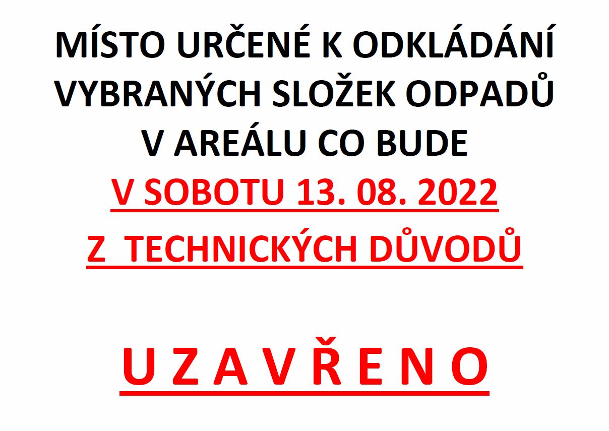 Místo určené k odkládání vybraných složek odpadů v areálu CO bude v sobotu 13.08.2022 z technických důvodů uzavřeno.