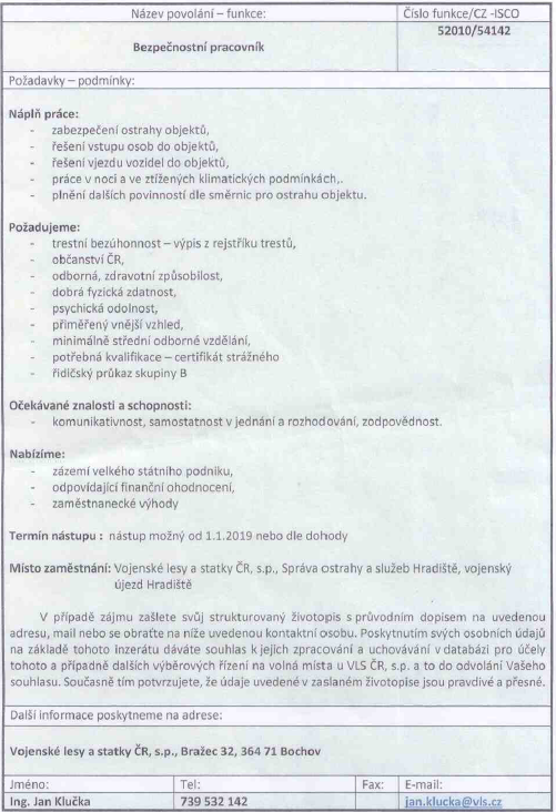 Další informace Vám poskytnou na adrese : Vojenské lesy a statky ČR, s.p., Bražec 32, 364 71 Bochov
