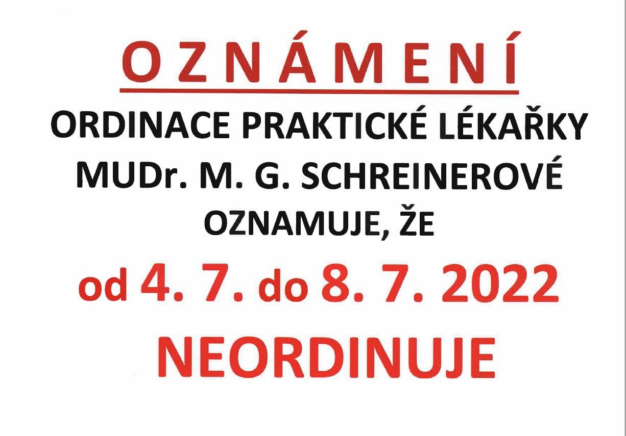 MUDr. Schreinerová neordinuje ve dnech od 4.7.- 8.7.22.