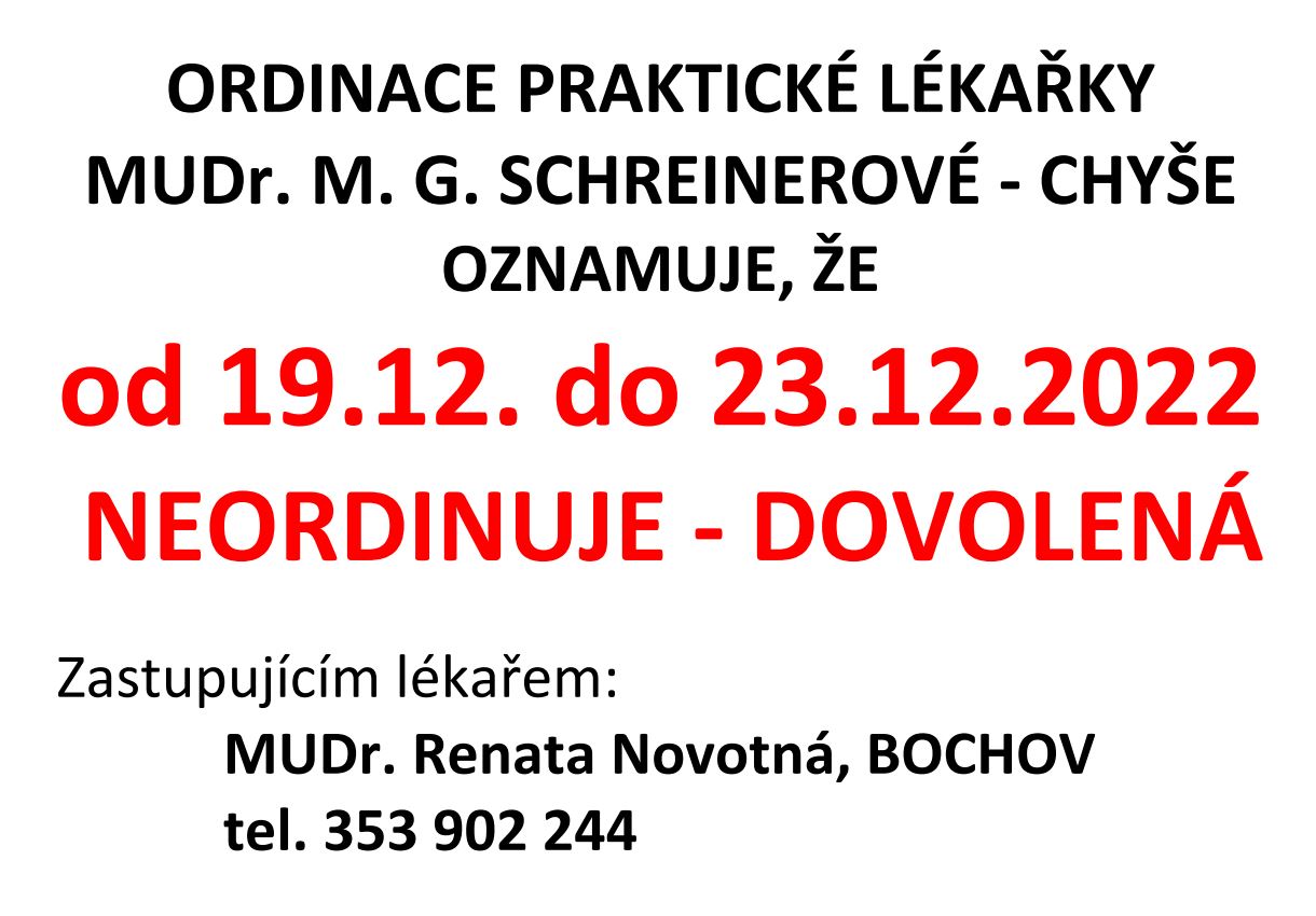 Oznámení - Dovolená MUDr. Schreinerová Neordinuje od 19.12.2022 - 23.12.2022. Zastupujícím lékařem je: MUDr. Renata Novotná, Bochov tel. 353 902 244