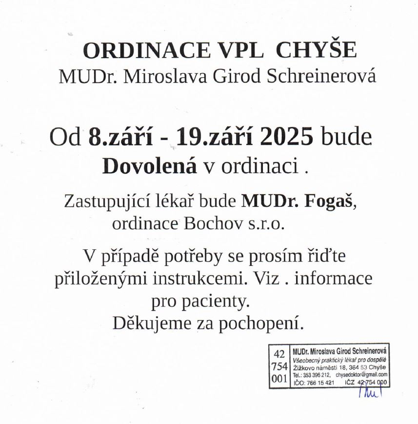 08.09. - 19.09.2025 bude ordinace uzavřena u důvodu dovolené. Zastupující lékař je MUDr. Vladimír Fogaš, Bochov tel.č.: 353 902 244 email: sestra.bochov@seznam.cz
