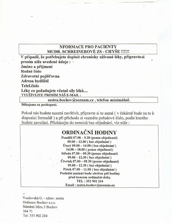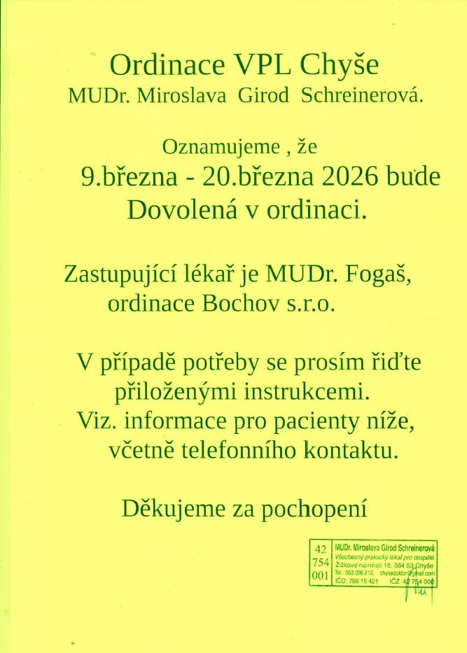 Od 09.03. - 20.03.2026 bude ordinace uzavřena u důvodu dovolené. Zastupující lékař je MUDr. Vladimír Fogaš, Bochov