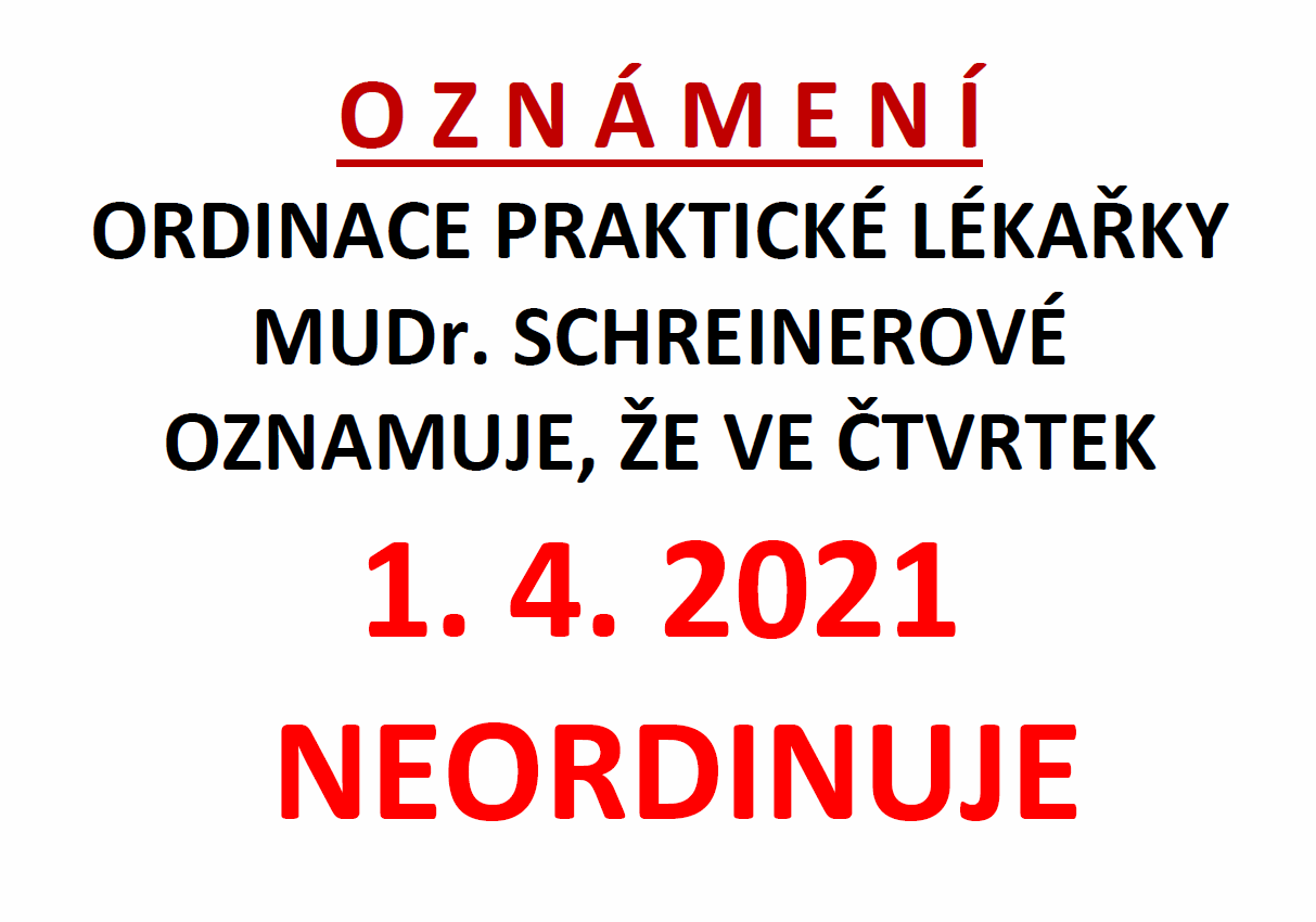 Ordinace praktické lékařky MUDr. Schreinerové oznamuje, že ve čtvrtek 01.04.2021 neordinuje.