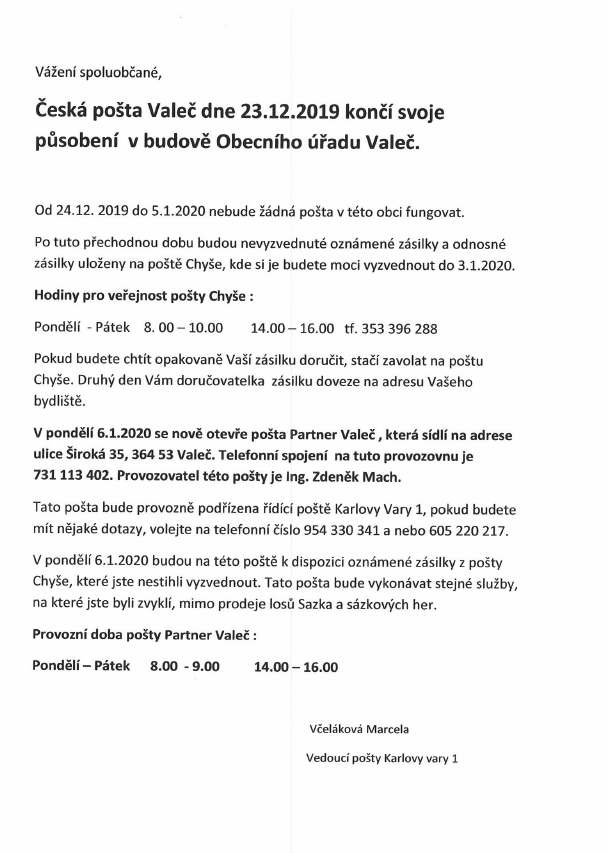 Informace o ukončení pošty Valeč