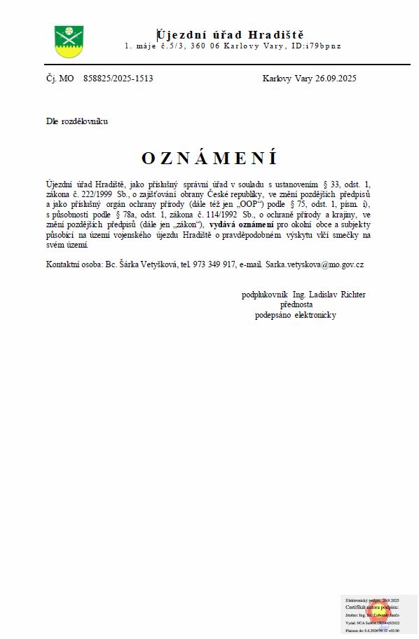 Újezdní úřad Hradiště, jako příslušný správní úřad v souladu s ustanovením § 33, odst. 1, zákona č. 222/1999 Sb., o zajišťování obrany České republiky, ve znění pozdějších předpisů a jako příslušný orgán ochrany přírody (dále též jen „OOP“) podle § 75, odst. 1, písm. i), s působností podle § 78a, odst. 1, zákona č. 114/1992 Sb., o ochraně přírody a krajiny, ve znění pozdějších předpisů (dále jen „zákon“), vydává oznámení pro okolní obce a subjekty působící na území vojenského újezdu Hradiště o pravděpodobném výskytu vlčí smečky na svém území.