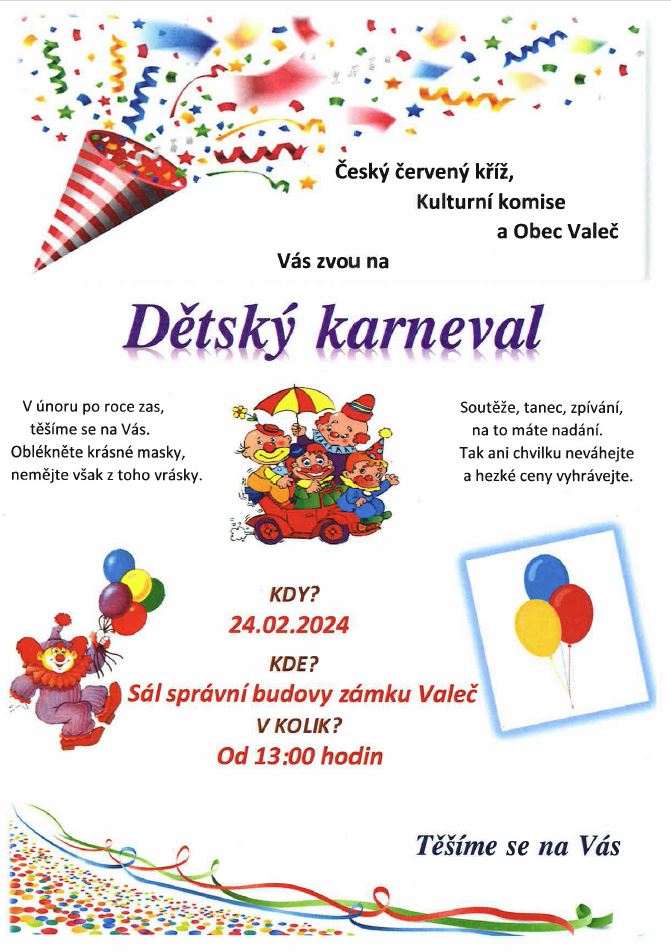 Český červený kříž, Kulturní komise a Obec Valeč Vás zvou na Dětský karneval, který se koná v sobotu 24.02.2024 od 13:00 hodin v sále správní budovy zámku Valeč.