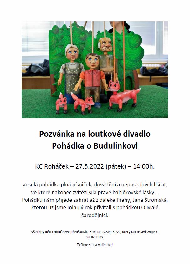 Loutkové divadlo - Pohádka O Budulínkovi Komunitní centrum Roháček ve Valči 27.5.2022 od 14:00 hodin.