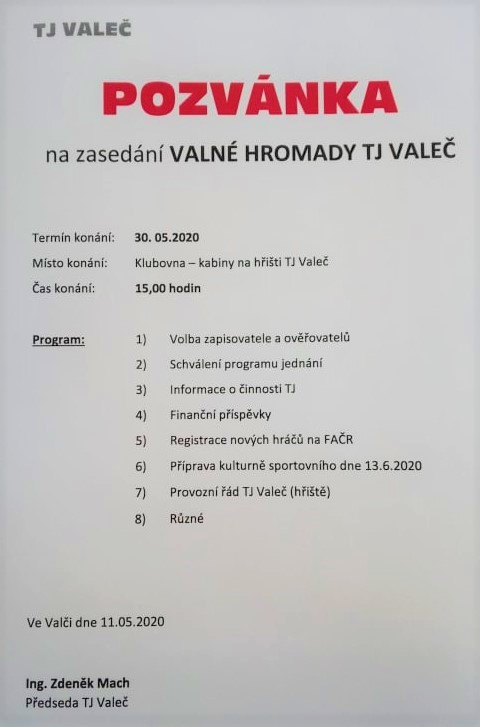 Valná hromada se uskuteční 30.5.2020 od 15:00 hodin v klubovně-kabinách na hřišti TJ Valeč.