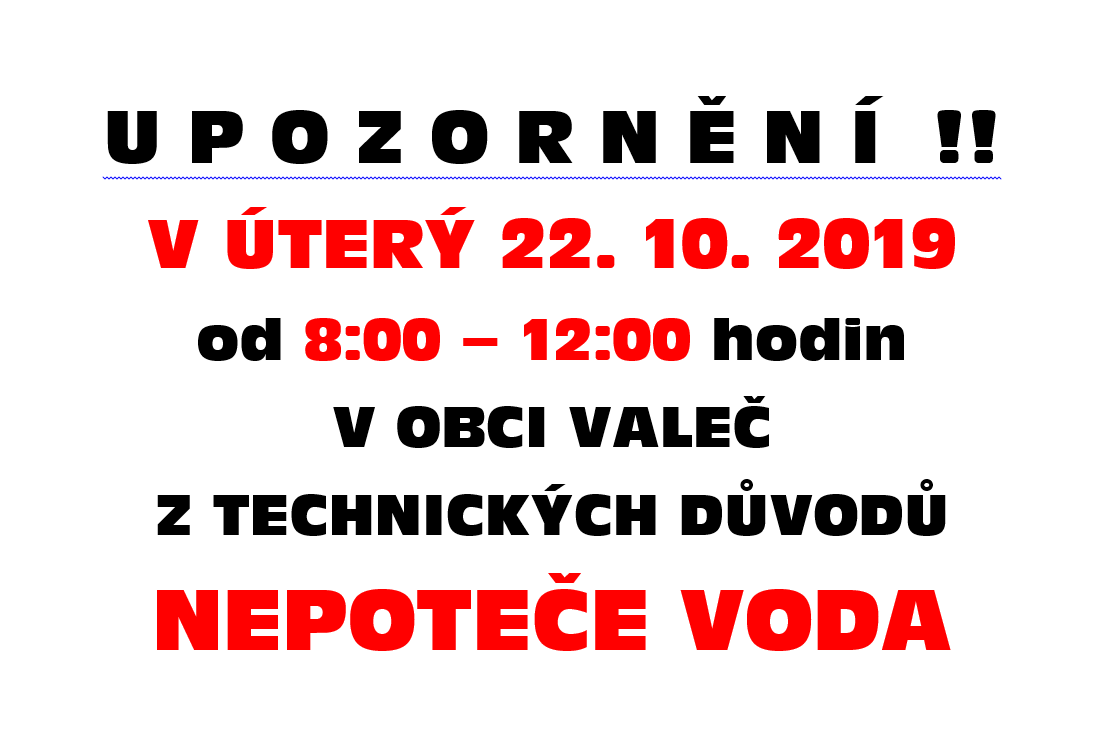 V úterý 22.10.2019 od 08:00 - 12:00 hodin v obci Valeč nepoteče voda z technických důvodů. Děkujeme za pochopení.
