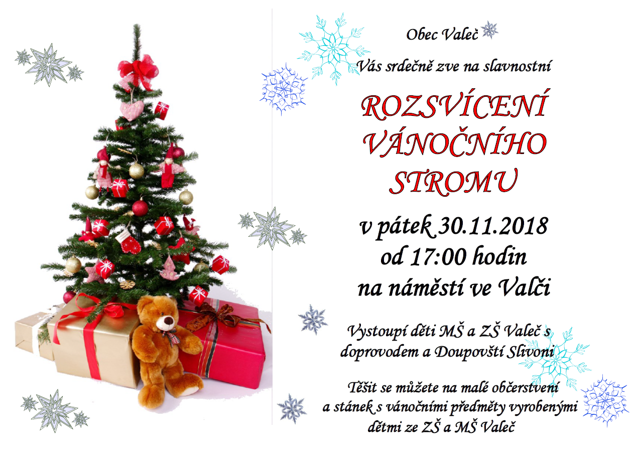 Obec Valeč Vás zve na akci Rozsvícení vánočního stromečku. Akce se koná v pátek 30.11.2018 od 17:00 hodin na náměstí ve Valči.
