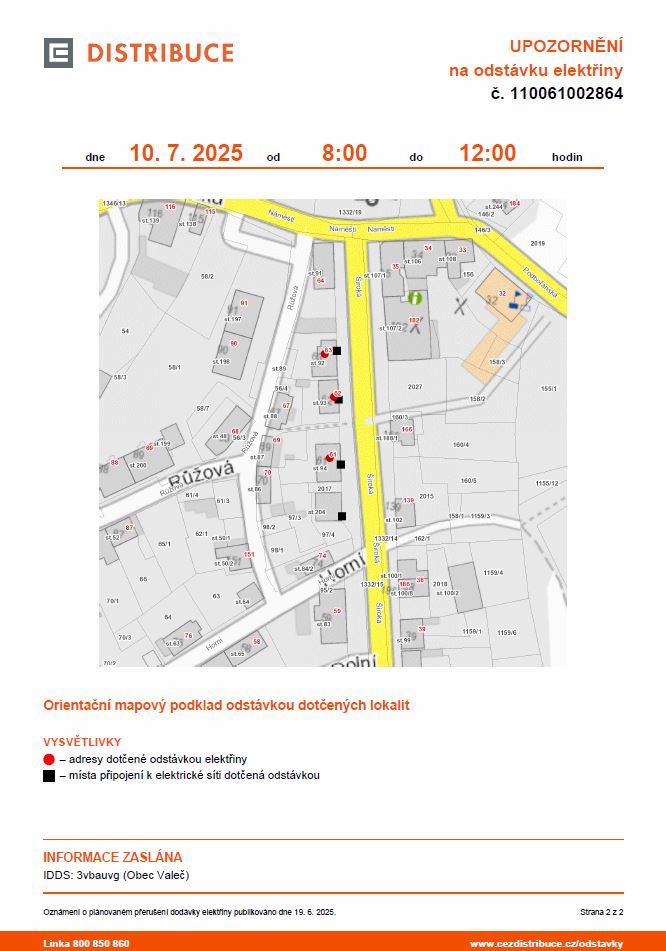 Upozornění odstávka elektřiny je ve čtvrtek 03.07.2025 ve Valči č. p. 61, 62, 63 od 08:00 - 12:00 hodin