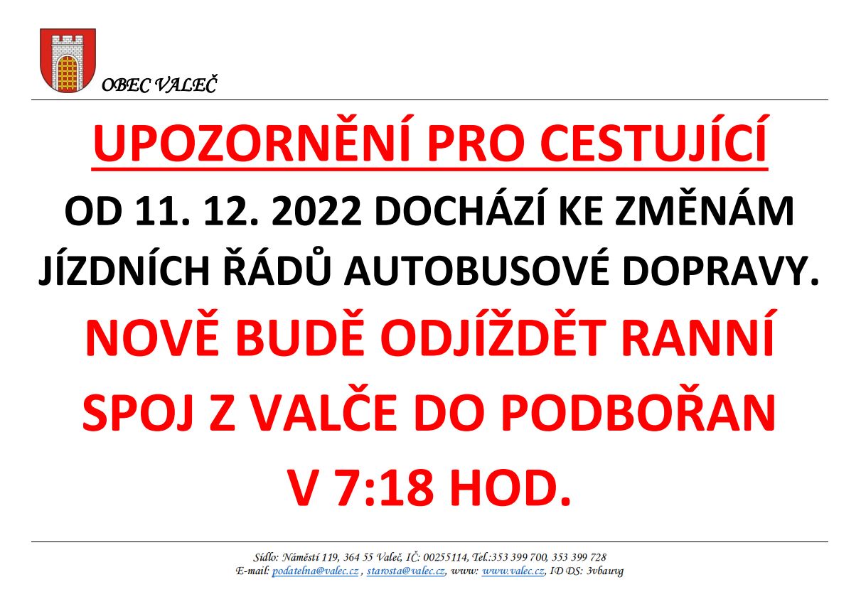 Od 11. 12. 2022 dochází ke změnám jízdních řádů autobusové dopravy. Nově bude odjíždět ranní spoj z Valče do Podbořan v 7:18 hod.