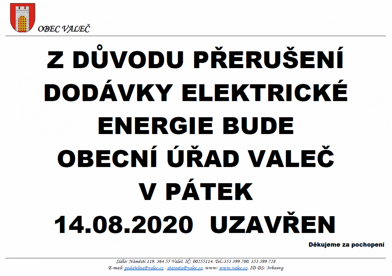 Z důvodu přerušení dodávky elektrické energie bude obecní úřad Valeč v pátek 14.08.2020 uzavřen. Děkujeme za pochopení