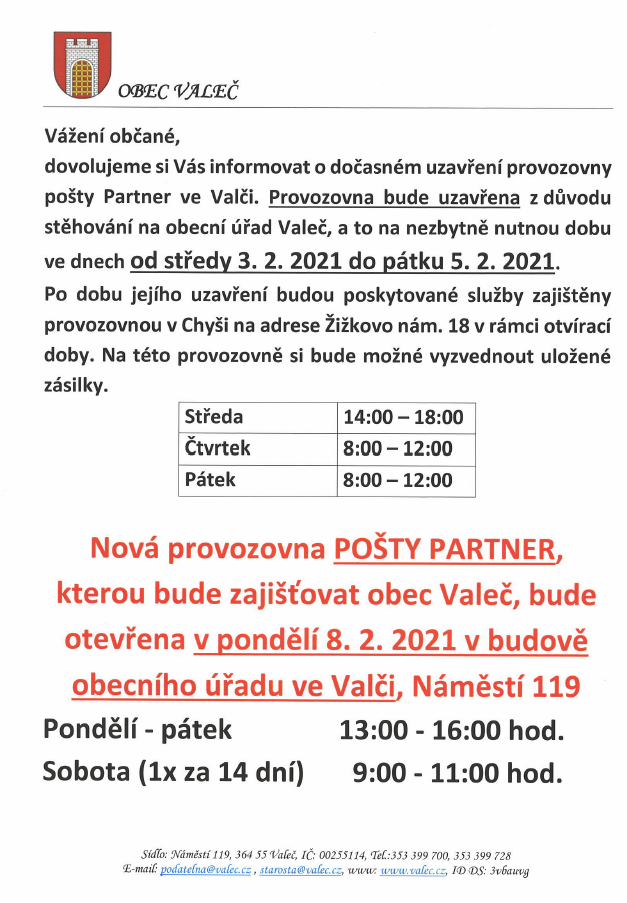 Uzavření provozovny POŠTY PARTNER ve VALČI