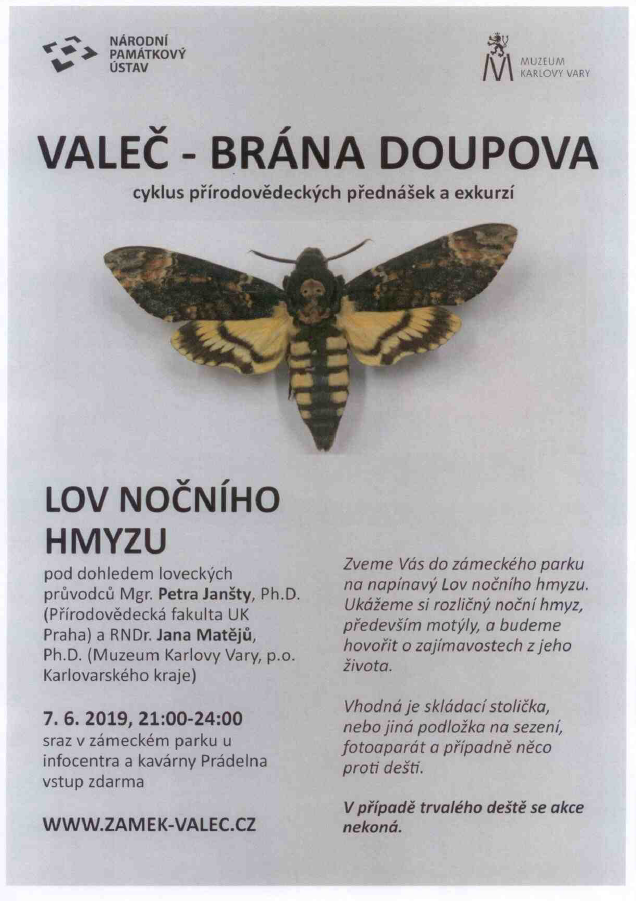 Lov nočního hmyzu spojený s přednáškou. Dne 7.6. 2019 od 21:00-24:00 hodin. Sraz v zámeckém parku, vstup zdarma.