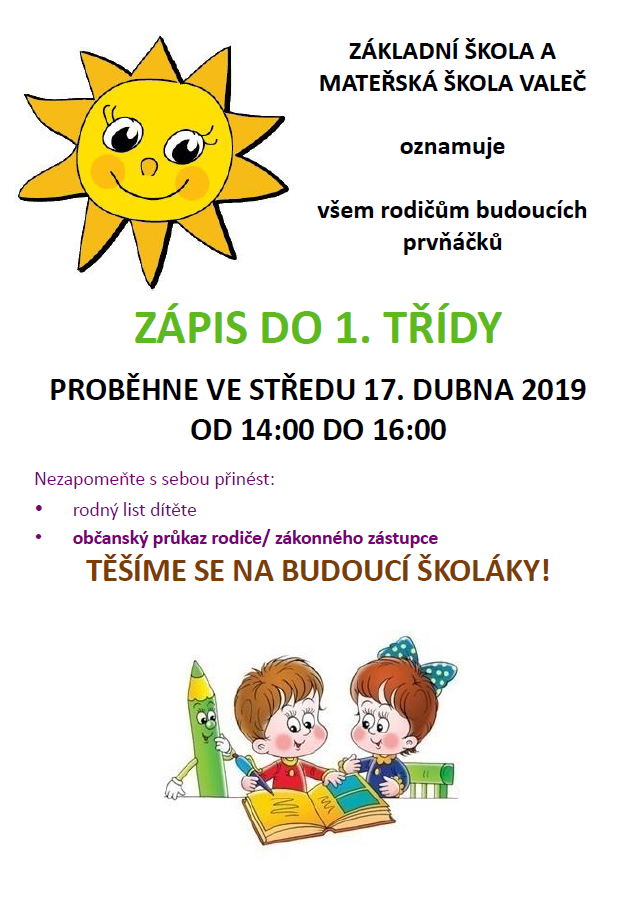Zápis dětí do 1. třídy základní školy se koná ve středu 17. dubna 2019 od 14:00 do 16:00 hodin v budově ZŠ a MŠ Valeč.