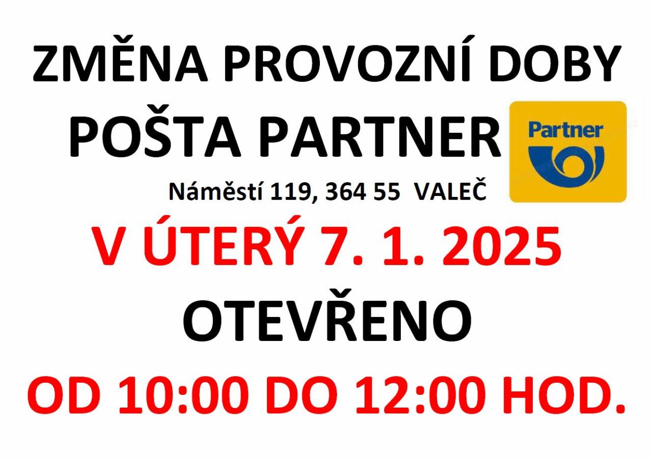 Změna provozní doby pošty Partner Valeč 07.01.2025 bude pošta otevřena od 10:00 - 12:00 hodin