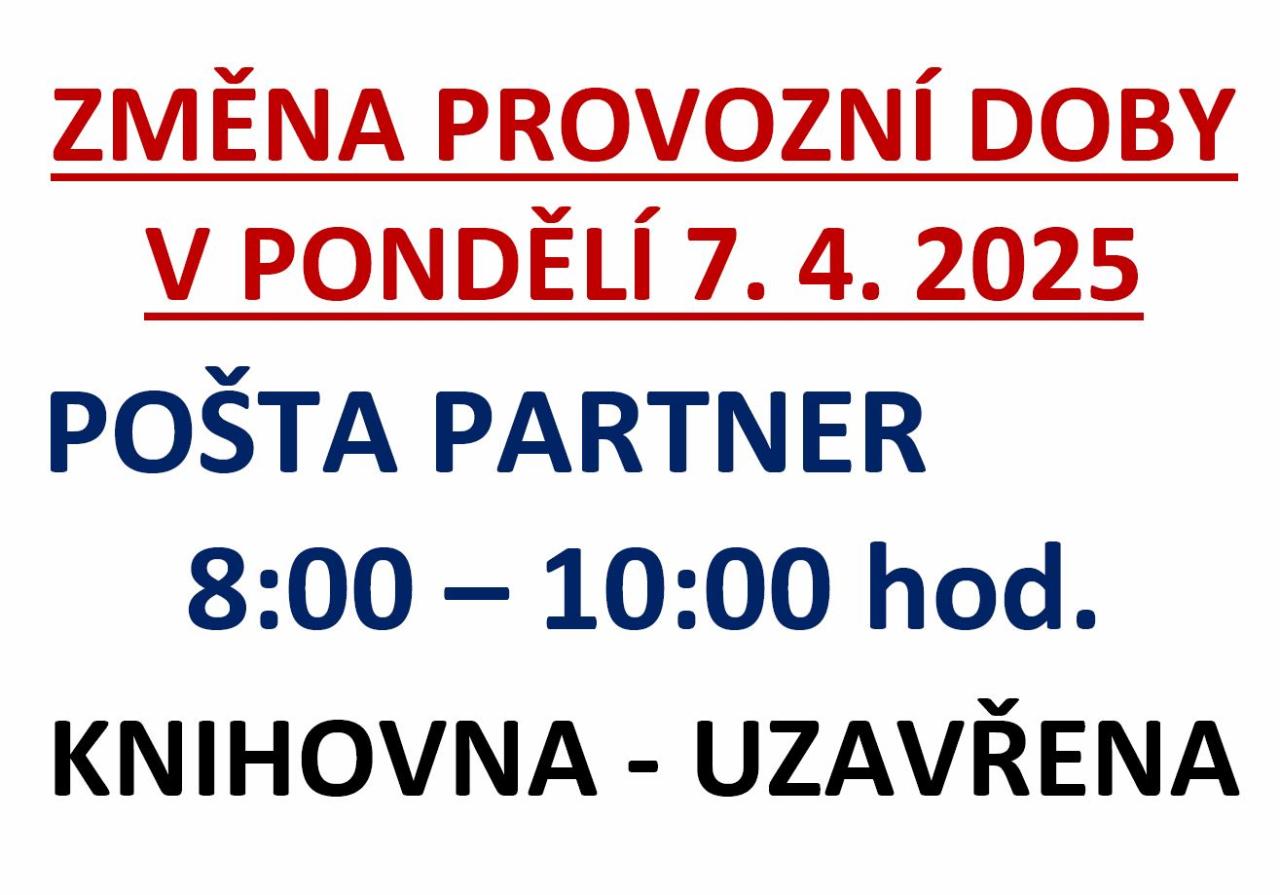 Pošta Partner otevřena 07.04.2025 od 08:00 - 10:00 hodin. Knihovna Valeč uzavřena