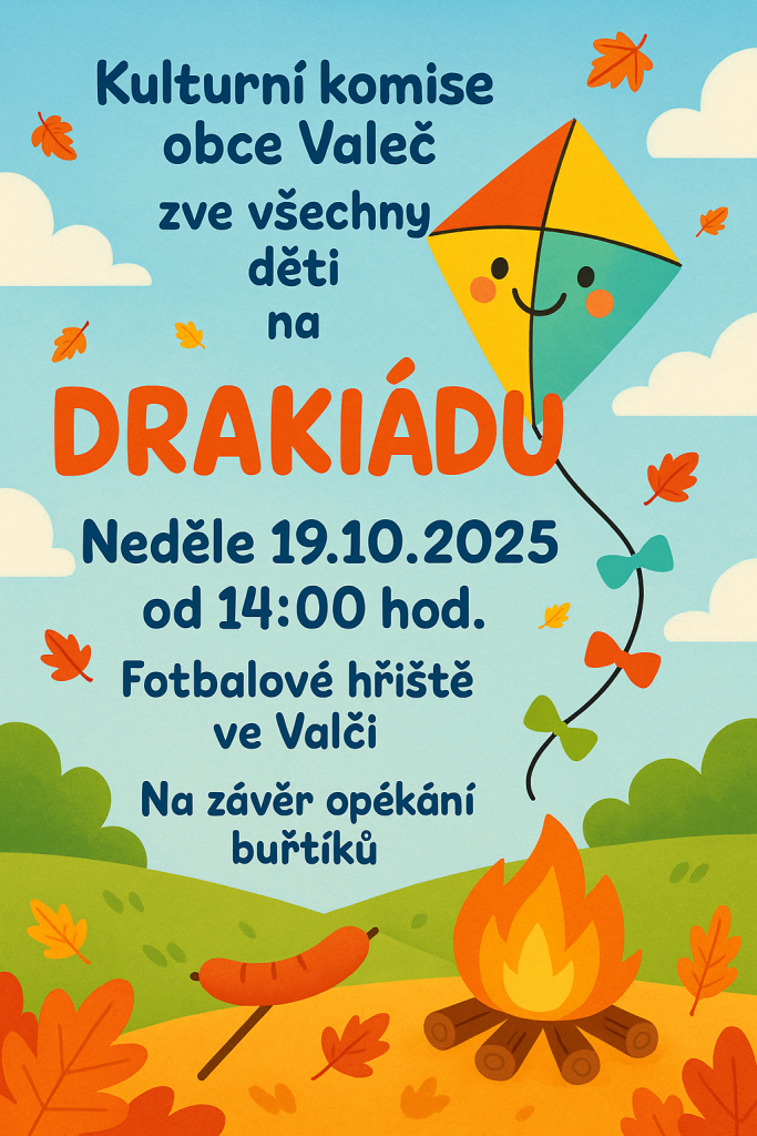 Kulturní komise obce Valeč zve všechny děti na drakiádu, která se koná v neděli 19.října 2025 od 14:00 hodin na fotbalovém hřišti ve Valči.